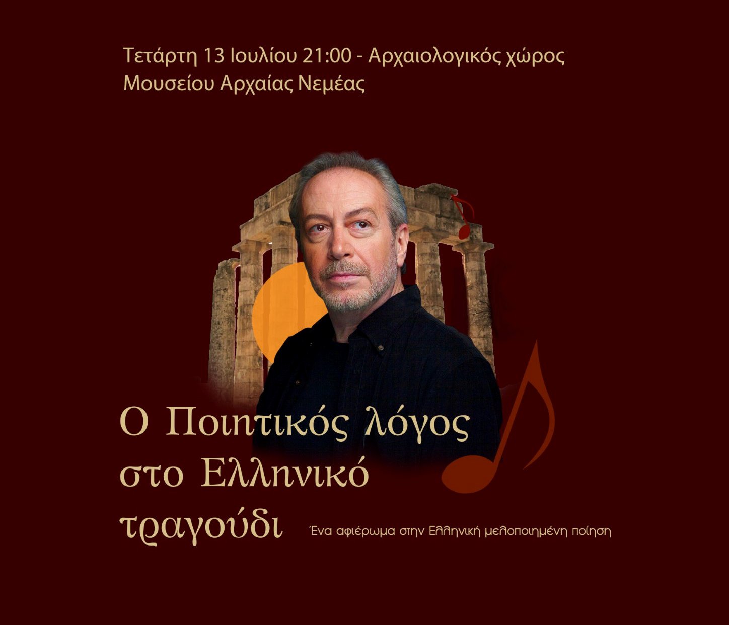Τετάρτη 13 Ιουλίου στις 21.00, στον αρχαιολογικό χώρο του Μουσείου της Αρχαίας Νεμέας θα πραγματοποιηθεί πολιτιστική εκδήλωση – αφιέρωμα στην ελληνική μελοποιημένη ποίηση.