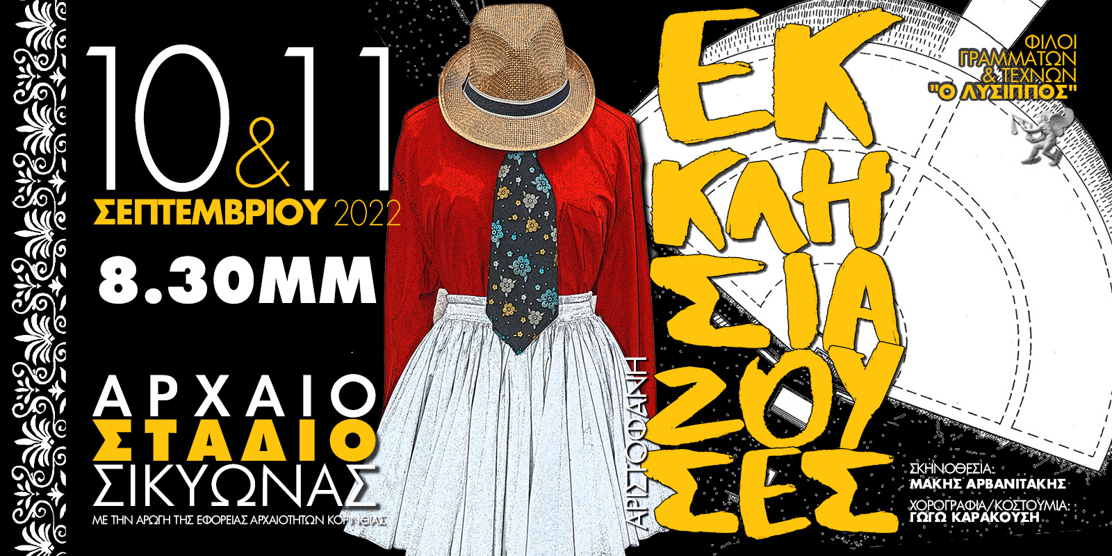 Το έργο «Εκκλησιάζουσες» παρουσιάστηκε στο αρχαίο Στάδιο της Σικυώνος, στο χώρο της σφενδόνης, στις 10 και 11 Σεπτεμβρίου 2022, με πρωτοβουλία των Φίλων Γραμμάτων και Τεχνών «Ο Λύσιππος», που είχαν και την επιμέλεια της παράστασης, της επίλυσης των προβλημάτων, του καθαρισμού και της καθαριότητας. Ο χώρος της σφενδόνης είναι ιδανικός για παραστάσεις λόγω της εξαιρετικής ακουστικής που διαθέτει.