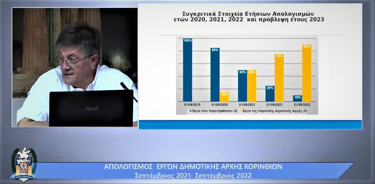 «Η Διεύθυνση Τεχνικών Υπηρεσιών του δήμου Κορινθίων στον ετήσιο απολογισμό ενώπιον του πολίτη ο οποίος είναι ο τελικός μας κριτής παρουσιάζει τα πεπραγμένα της, πεπραγμένα τα οποία χωρίζονται σε δυο κατηγορίες , έργα που παραλάβαμε από την προηγούμενη δημοτική αρχή και αυτά που η παρούσα δημοτική αρχή μελέτησε, δημοπράτησε και εκτέλεσε.