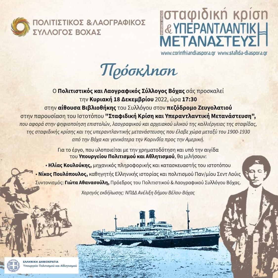 Η Αντιπεριφερειάρχης Κορινθίας κα Αθηνά Κόρκα παρευρέθηκε στην παρουσίαση του Ιστότοπου «Σταφιδική Κρίση και Υπερατλαντική Μετανάστευση» που αφορά την ψηφιοποίηση επιστολών λαογραφικού και αρχειακού υλικού της καλλιέργειας της σταφίδας, που έλαβε χώρα μεταξύ του 1900 -1930.