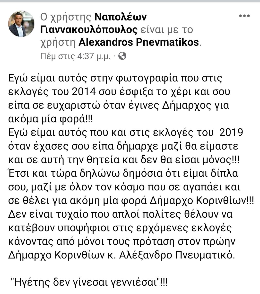 Και συνεχίζει «Έτσι και τώρα δηλώνω δημόσια ότι είμαι δίπλα σου, μαζί με όλον τον κόσμο που σε αγαπάει και σε θέλει για ακόμη μία φορά Δήμαρχο Κορινθίων»