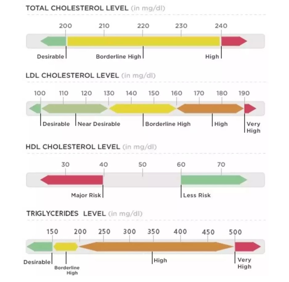 -Στην HDL, μια τιμή κάτω 40 mg/dL (1 mmol/L) για τους άνδρες και 50 mg/dL (1,3 mmol/L) για τις γυναίκες είναι χαμηλή. Αυτό αυξάνει τον κίνδυνο καρδιαγγειακών προβλημάτων.