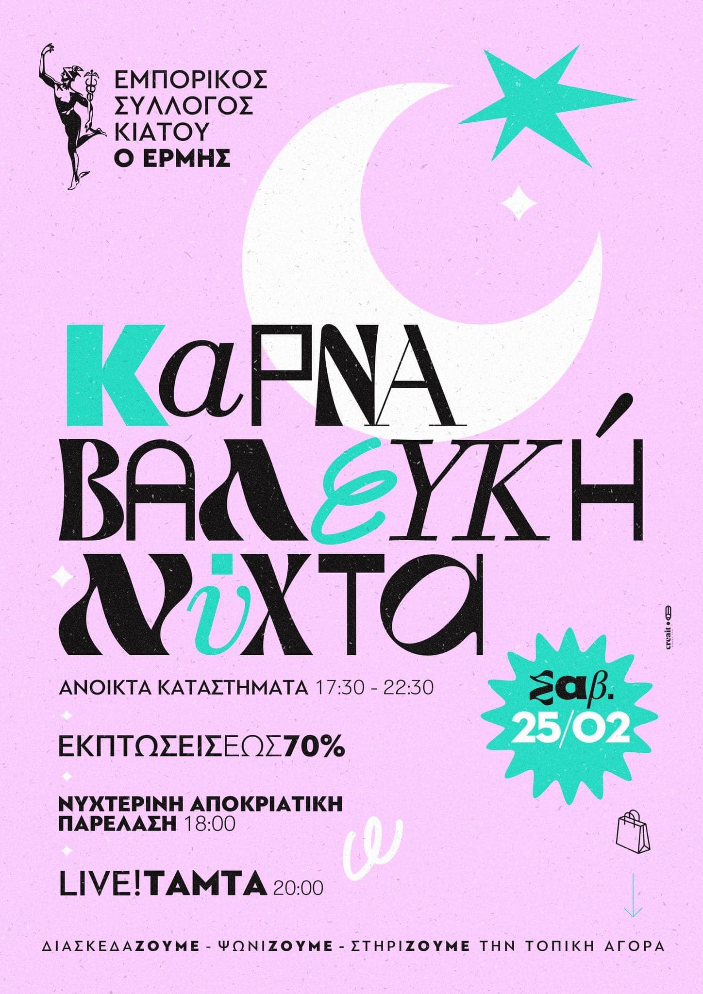 Καρναβαλική Νύχτα στην Αγορά Κιάτου. Ανοιχτά καταστήματα, μεγάλε εκπτώσεις, party, μουσική.
