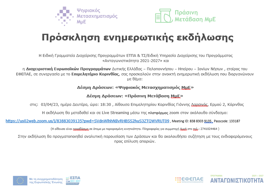 Η εκδήλωση διοργανώνεται στο πλαίσιο του σχεδιασμού ενημερωτικών εκδηλώσεων της Ειδικής Γραμματείας Διαχείρισης Προγραμμάτων ΕΤΠΑ & ΤΣ/ Ειδική Υπηρεσία Διαχείρισης του Προγράμματος «Ανταγωνιστικότητα 2021-2027» και του ΕΦΕΠΑΕ (Ενδιάμεσος Φορέας Επιχειρησιακού Προγράμματος Ανταγωνιστικότητα & Επιχειρηματικότητα). Ως εταίρος του ΕΦΕΠΑΕ στην πρόσκληση συμμετέχει και η Διαχειριστική Ευρωπαϊκών Προγραμμάτων Δυτικής Ελλάδας – Πελοποννήσου – Ηπείρου – Ιονίων Νήσων σε συνεργασία με το Επιμελητήριο Κορινθίας.
