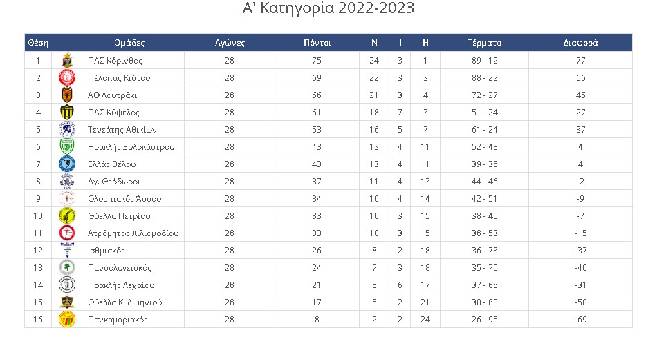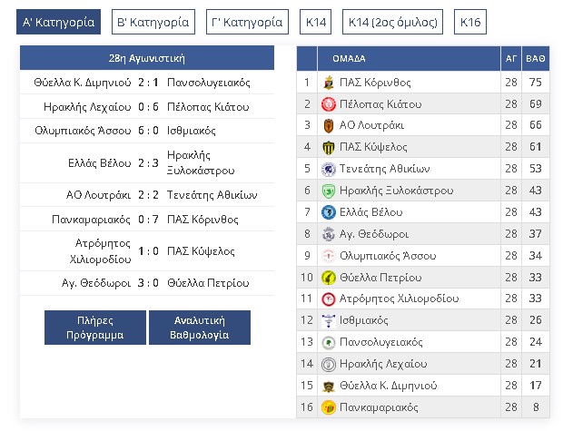 Δείτε τα Αποτελέσματα και την Αναλυτική Βαθμολογία για το Πρωτάθλημα της Α΄ Κατηγορίας της Κορινθίας.