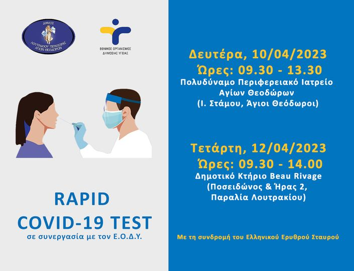 Ο Εθνικός Οργανισμός Δημόσιας Υγείας (ΕΟΔΥ) σε συνεργασία με τον Ελληνικό Ερυθρό Σταυρό και τον Δήμο Λουτρακίου – Περαχώρας – Αγίων Θεοδώρων θα διεξάγει δωρεάν ελέγχους ταχείας ανίχνευσης αντιγόνου (rapid test) Covid-19.