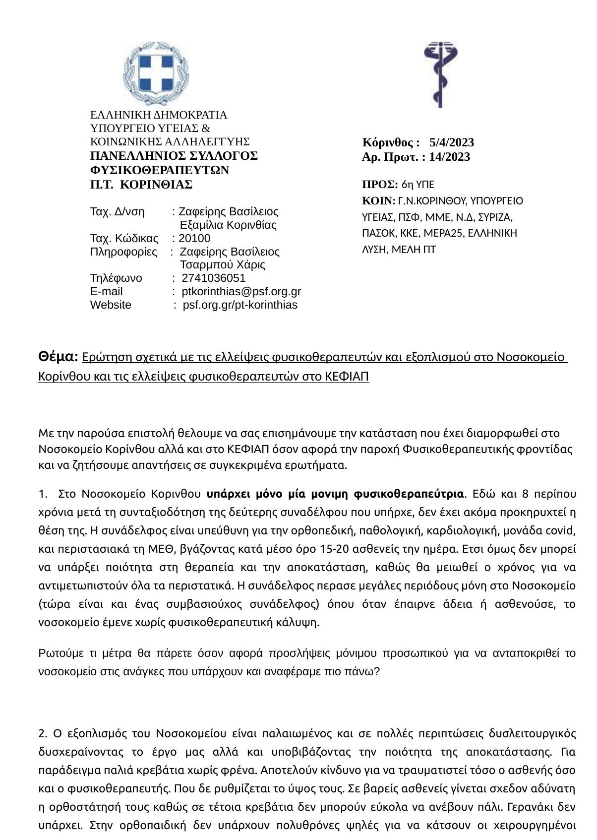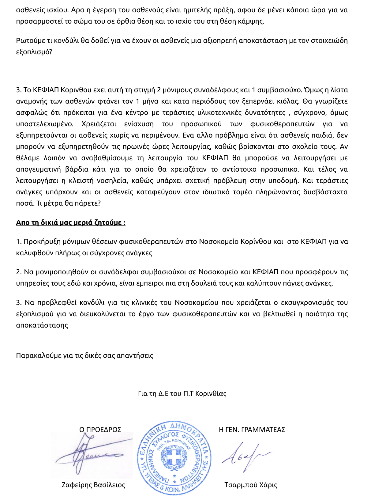 Θέμα: Σχετικά με τις ελλείψεις φυσικοθεραπευτών και εξοπλισμού στο Γενικό Νοσοκομείο Κορίνθου και τις ελλείψεις φυσικοθεραπευτών στο ΚΕΦΙΑΠ