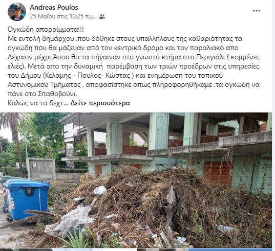 Ο πρόεδρος του Λεχαίου Αντρέας Πούλος κατέγραψε τις εικόνες και τις πόσταρε στο διαδίκτυο. Προφανώς έχοντας ο ίδιος πράξει το καθήκον του στην ενημέρωση των συμπολιτών του ΝΑ ΜΗΝ βγάζουν τα ογκώδη για όσο δεν υπάρχει σύμβαση αποκομιδής, δείχνει με τον δάχτυλο τον αντιδήμαρχο καθαριότητας με τον οποίον – ως γνωστόν- τελευταία υπάρχει κόντρα.