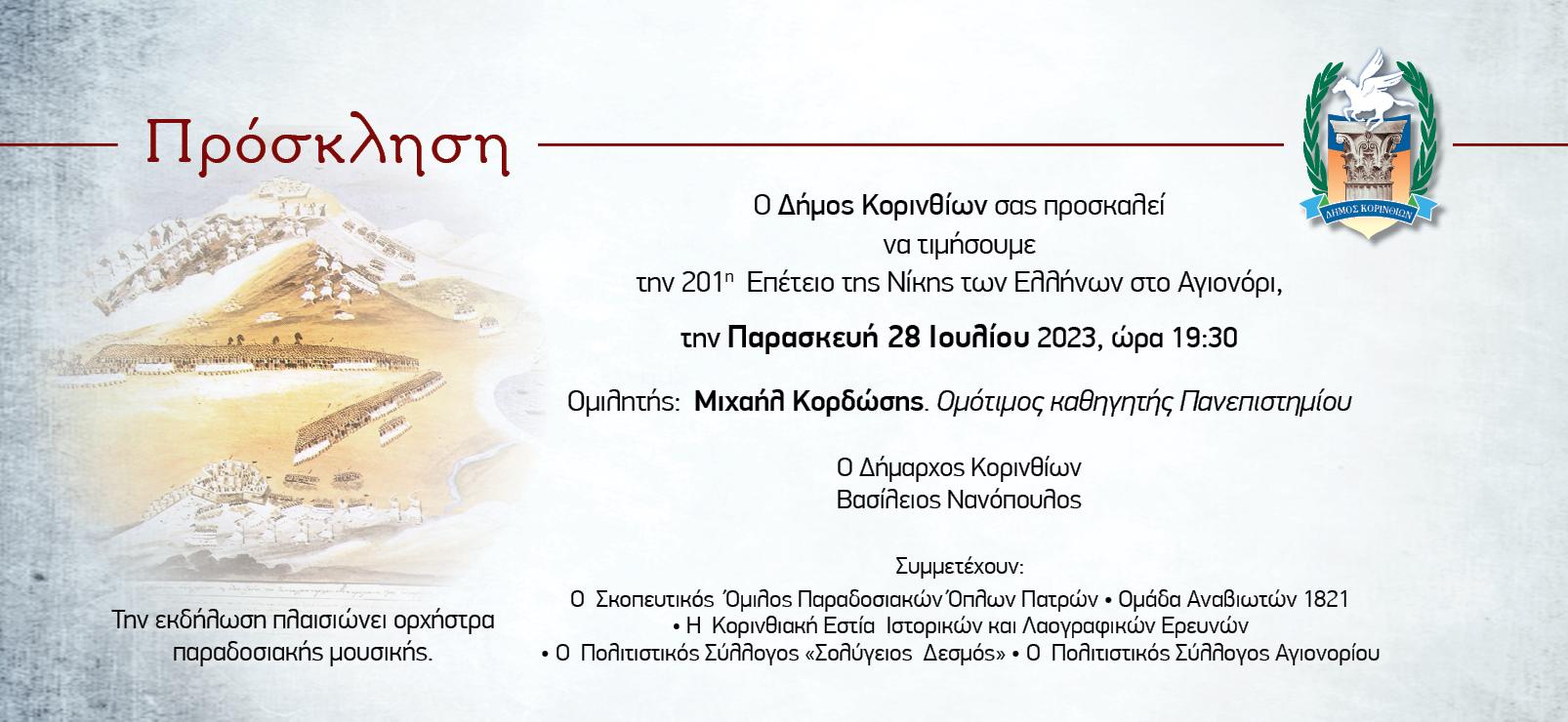 Ο Δήμος Κορινθίων τιμά με κάθε επισημότητα και λαμπρότητα την ιστορική μάχη του Αγιονορίου, την κομβική για την Ελληνική επανάσταση Νίκη και την αυτοθυσία τον Αγιονοριτών.