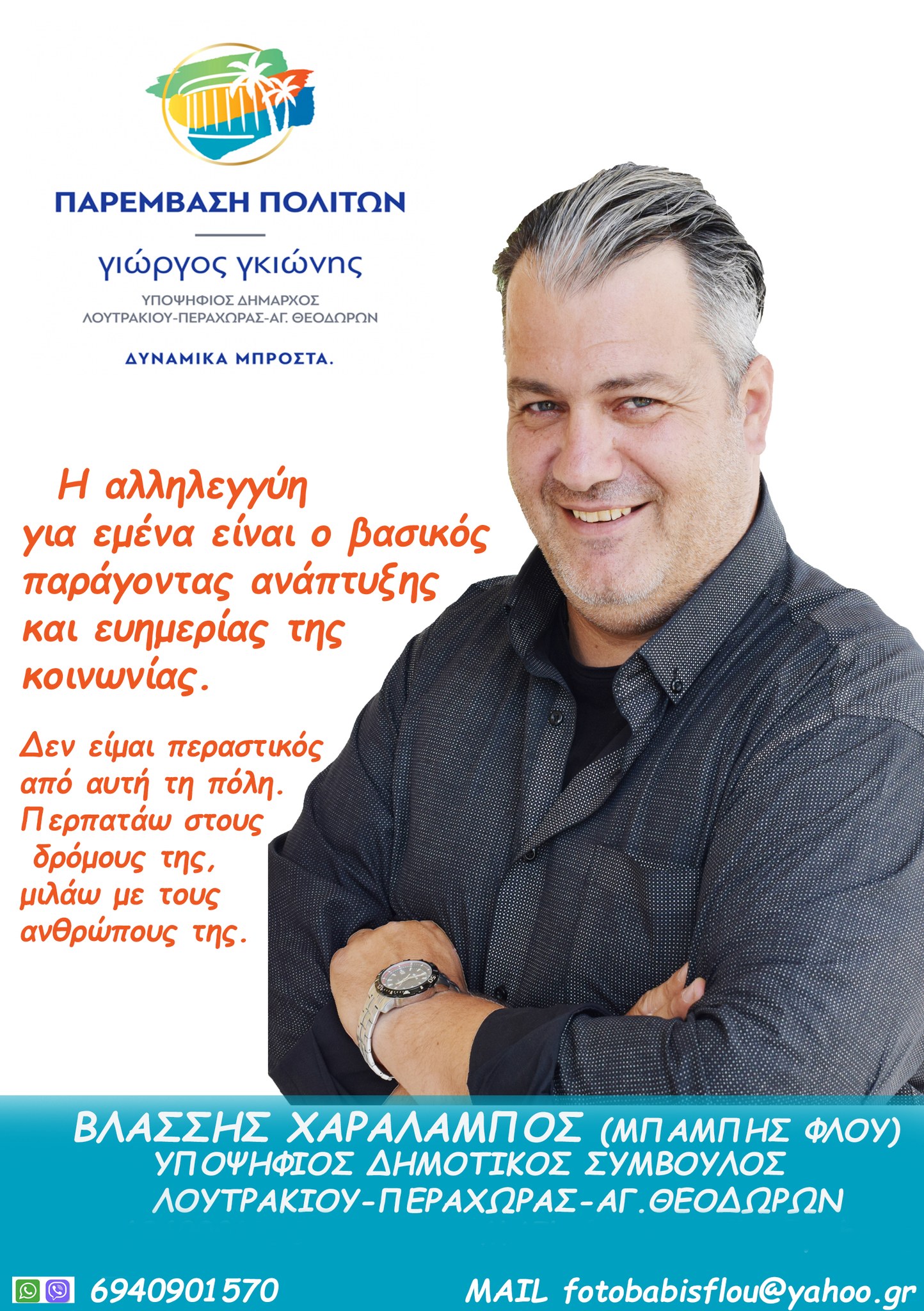 • Ο Χαράλαμπος (Μπάμπης) Βλάσσης ή Μπάμπης ο Φλου, γνωστός φωτογράφος και επί σειρά ετών συνεργάτης του loutrakiblog.gr είναι υποψήφιος δημοτικός σύμβουλος με την Παρέμβαση Πολιτών του Γιώργου Γκιώνη.