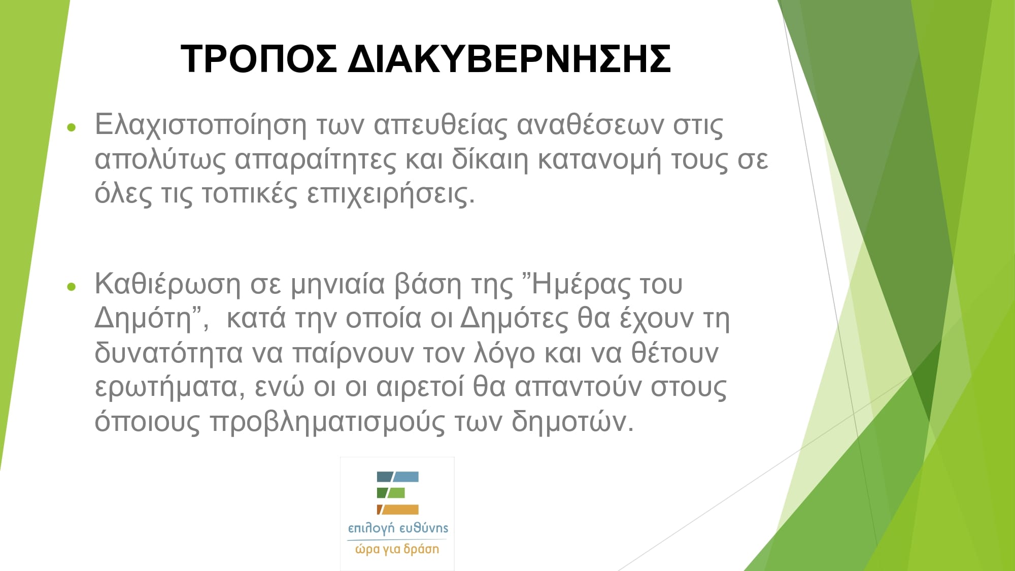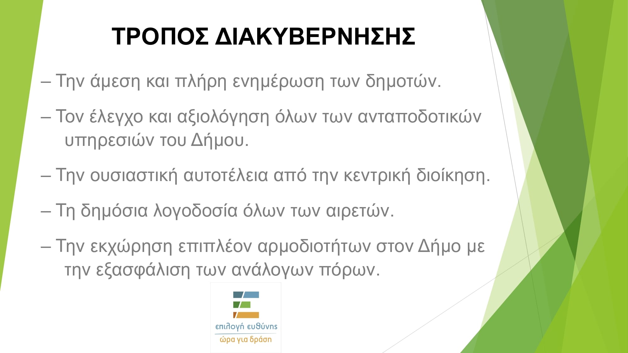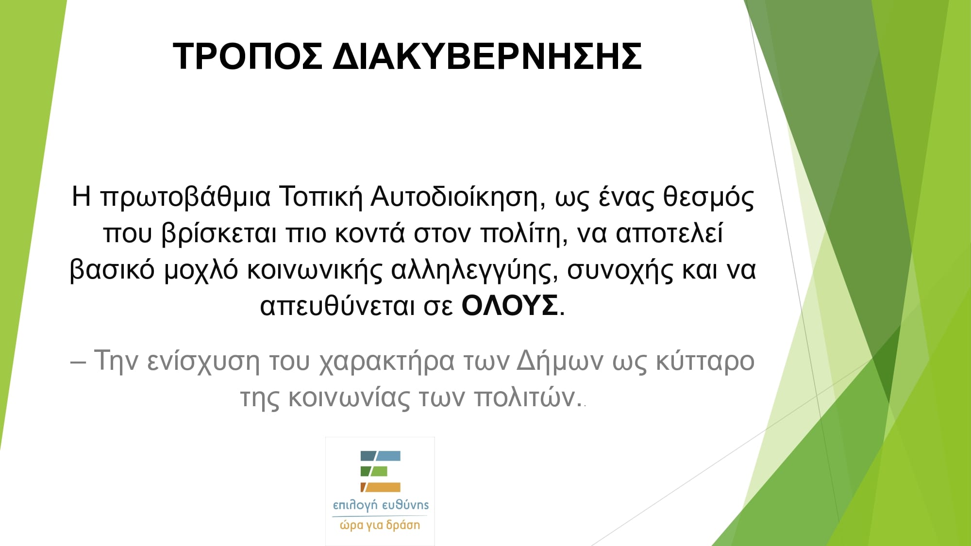 Ο υποψήφιος δήμαρχος Λουτρακίου-Περαχώρας-Αγίων Θεοδώρων, Κωστής Ζερβός, επικεφαλής της παράταξής ΕΠΙΛΟΓΗ ΕΥΘΥΝΗΣ-ΩΡΑ ΓΙΑ ΔΡΑΣΗ, ανακοίνωσε τις προγραμματικές του θέσεις για το μοντέλο διοίκησης του δήμου και την κοινωνική πολιτική.