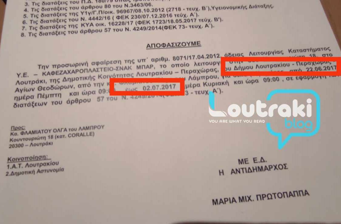 Τον καιρό που ήταν αντιδήμαρχος των Οικονομικών Υπηρεσιών και αναπληρώτρια δημάρχου, έβαλε φαρδιά πλατιά την υπογραφή της και να μπει λουκέτο σε επιχειρήσεις εστίασης (Cafe, Bar, ταβέρνες) στο Λουτράκι… Και ναι, ήταν υποχρεωμένη, βάσει Νόμου, αλλά γιατί δεν παραιτήθηκε τότε αλλά παρέμεινε στη θέση της μέχρι παραμονές των εκλογών;;;