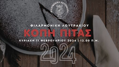 - Την Κυριακή 11 Φεβρουαρίου 2024 και ώρα 12.00 π.μ. στην αίθουσα της Φιλαρμονικής στο Πνευματικό Κέντρο θα πραγματοποιηθεί η καθιερωμένη κοπή της πρωτοχρονιάτικης πίτας του μουσικού σώματος της Filarmoniki Loutrakiou.
