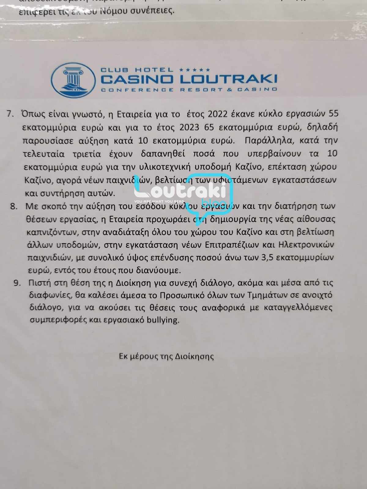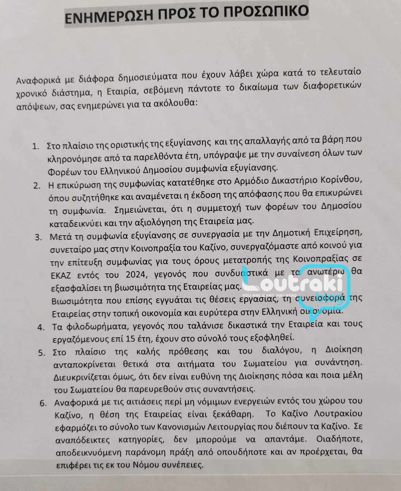 - Στις επισυναπτόμενες φωτογραφίες, θα δείτε την ενημέρωση της Διοίκησης της Club Hotel Casino Loutraki SA.