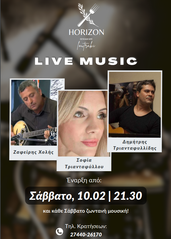Κάθε Σάββατο, από τις 10.02, έρχεται ζωντανή μουσική στο Horizon, με ξεχωριστούς καλεσμένους, για να δώσει στο Σαββατοκύριακό σας έναν ξεχωριστό ρυθμό. Καλή μουσική, καλό φαγητό, καλή παρέα – τα απολύτως απαραίτητα. Σας περιμένουμε!» αναφέρει η Διεύθυνση του εστιατορίου