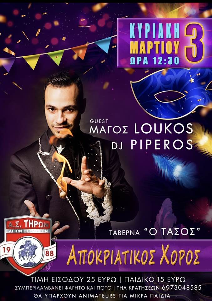 Ο Α.Σ. ΤΗΡΩΝ Αγίων Θεοδώρων σας προσκαλεί στον αποκριάτικο χορό την Κυριακή 3 Μαρτίου στην Ταβέρνα “Ο Τάσος”