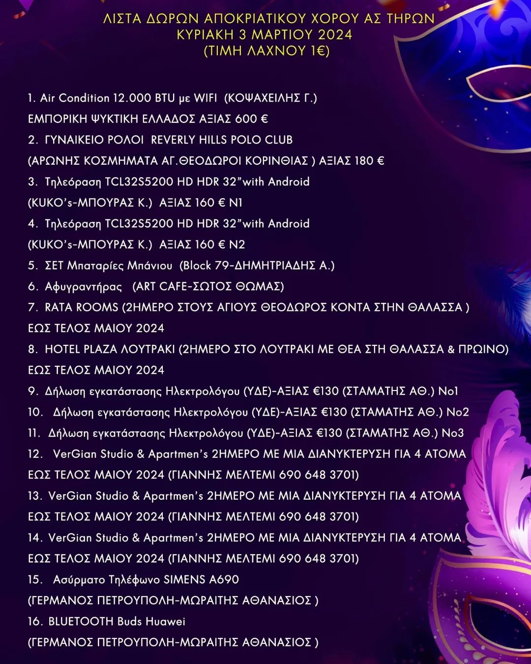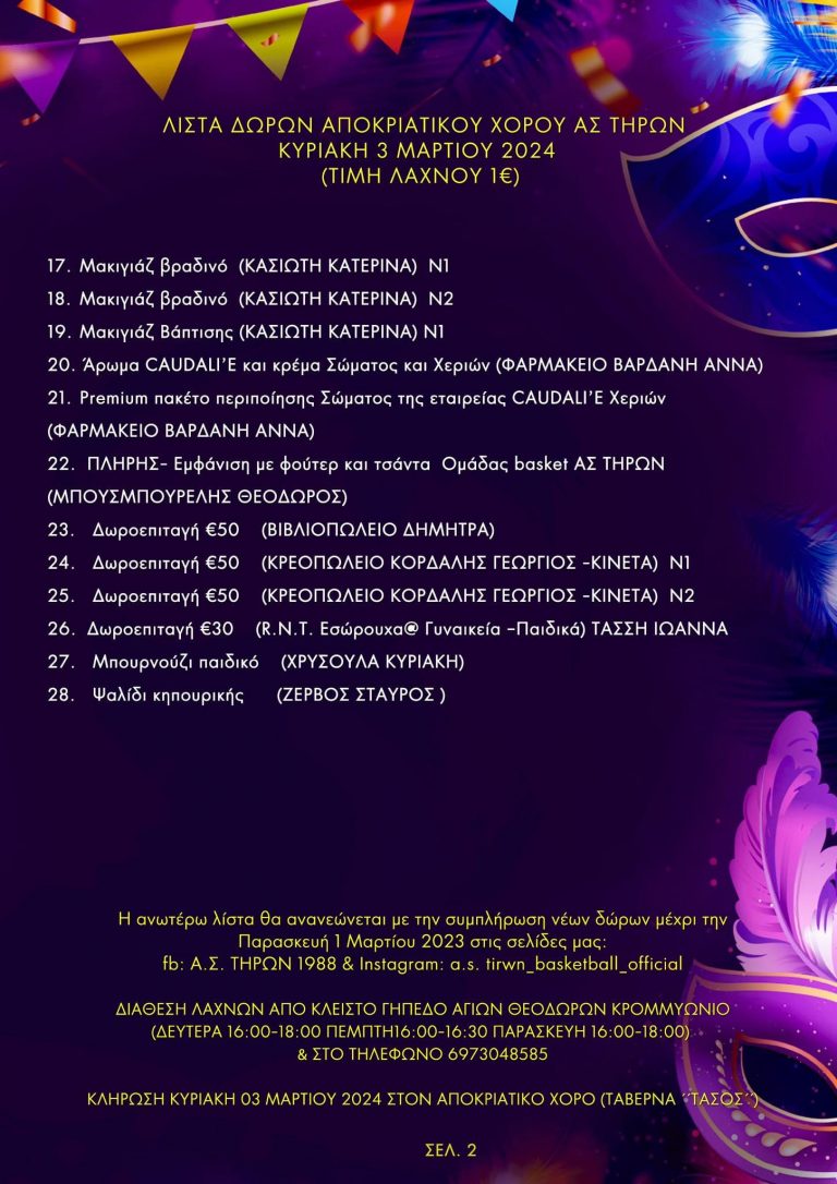 • Ο Α.Σ. ΤΗΡΩΝ Αγίων Θεοδώρων σας προσκαλεί στον αποκριάτικο χορό την Κυριακή 3 Μαρτίου (12:30) στην Ταβέρνα “Ο Τάσος”