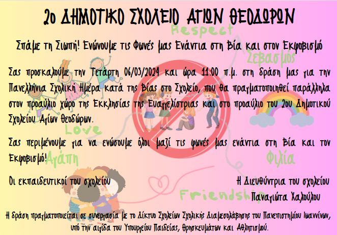 Την Τετάρτη 06/03/2024 και ώρα 10:30-11:30 οι μαθητές και οι μαθήτριες του 2ου Δημοτικού Σχολείου Αγίων Θεοδώρων ενώνουν τις φωνές τους και συμμετέχουν στη δράση «Σπάμε τη σιωπή! Ενώνουμε τις φωνές μας ενάντια στη Βία και τον Εκφοβισμό».