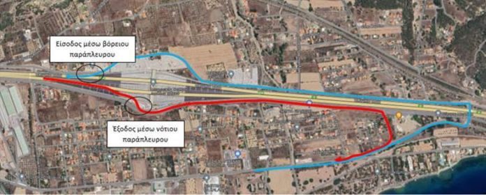 Ειδικότερα, η κυκλοφορία των οχημάτων με κατεύθυνση από Λουτράκι και Κόρινθο προς Καλαμάκι και Ίσθμια (ανατολικά της Διώρυγας) θα γίνεται μέσω προσωρινής εξόδου λίγο πριν το σταθμό διοδίων Ισθμού προς το νότιο παράπλευρο, που είναι η Παλαιά Εθνική Οδός «Αθηνών-Κορίνθου», όπως φαίνεται με το κόκκινο βέλος στο παρακάτω σχηματικό διάγραμμα.