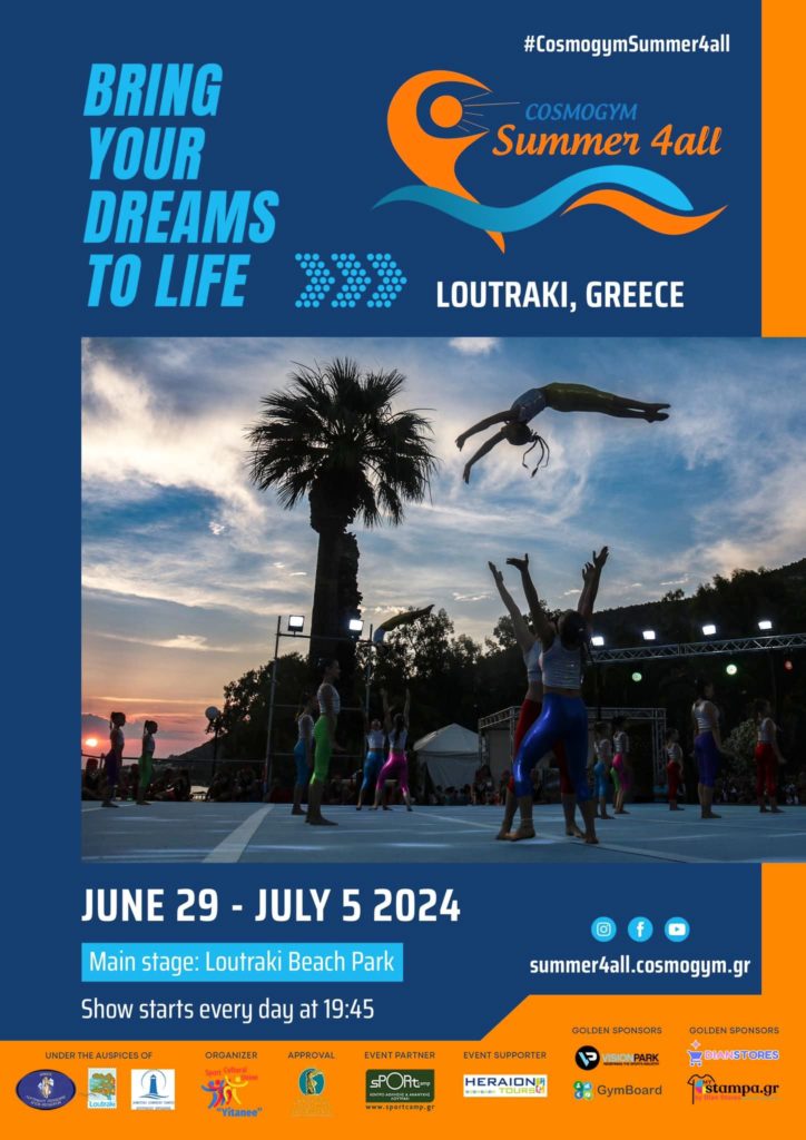 Περισσότερα από 2.000 άτομα αναμένεται να βρεθούν στο Λουτράκι, από το Σάββατο 29 Ιουνίου και μέχρι την Τετάρτη 5 Ιουλίου για το COSMOGYM – Summer4all, τη μεγάλη γιορτή της Γυμναστικής.