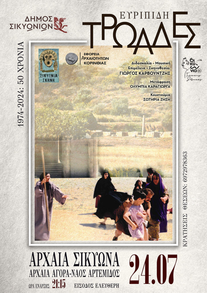 Η εμβληματική τραγωδία του μεγάλου τραγικού ποιητή Ευριπίδη “ΤΡΩΑΔΕΣ” (415 π.Χ.) –κατακραυγή και καταδίκη του ανθρώπινου παραλογισμού, της κτηνώδους βίας και της απανθρωπιάς του πολέμου – παρουσιάζεται την Τετάρτη 24 Ιουλίου 2024 (ημερομηνία σύμβολο) και ώρα 9:15 μ.μ., εντός της Αρχαίας Αγοράς της Σικυώνας (Ναός Αρτέμιδος) με είσοδο ελεύθερη για το κοινό.