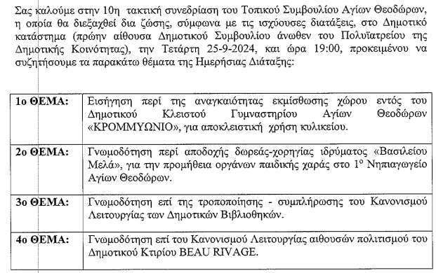 Το συμβούλιο, μεταξύ άλλων, καλείται να αποφανθεί για την μίσθωση κυλικείου εντός του κλειστού γυμναστηρίου Αγίων Θεοδώρων και την προμήθεια νέων οργάνων παιδικής χαράς για το 1ο νηπιαγωγείο.