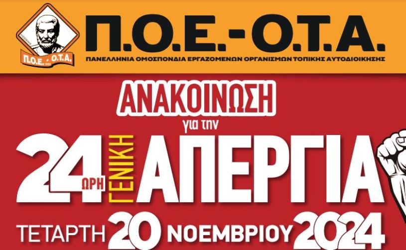 Η Πανελλήνια Ομοσπονδία Εργαζομένων Οργανισμών Τοπικής Αυτοδιοίκησης (Π.Ο.Ε.-Ο.Τ.Α.) ανακοινώνει την συμμετοχή της στην 24ωρη Γενική Πανελλαδική Απεργία που έχει προκηρύξει για την ΤΕΤΑΡΤΗ 20 ΝΟΕΜΒΡΙΟΥ 2024 η Α.Δ.Ε.Δ.Υ., με σκοπό την ανάδειξη των αιτημάτων των εργαζομένων στην Τοπική Αυτοδιοίκηση και τον Δημόσιο Τομέα γενικότερα, με κυρίαρχο αυτό της αύξησης των εισοδημάτων και την αντιμετώπιση της ακρίβειας που έχει πάρει εφιαλτικές διαστάσεις.