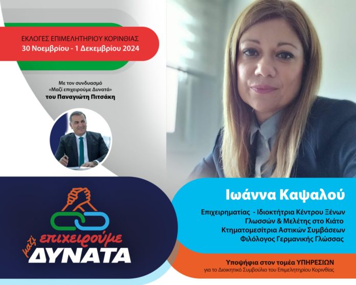 Μια ακόμα γυναίκα, επιτυχημένη επιχειρηματίας, η Ιωάννα Καψαλού από το Κιάτο, δηλώνει παρούσα, στις επιμελητηριακές εκλογές με το συνδυασμό του Παναγιώτη Πιτσάκη.