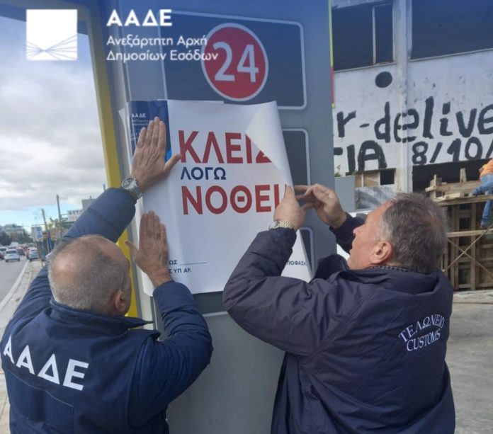 Οι ελεγκτές, μαζί με ένοπλους αστυνομικούς, σφράγισαν το πρατήριο για δύο χρόνια και προχωρούν στην επιβολή των προβλεπόμενων προστίμων.