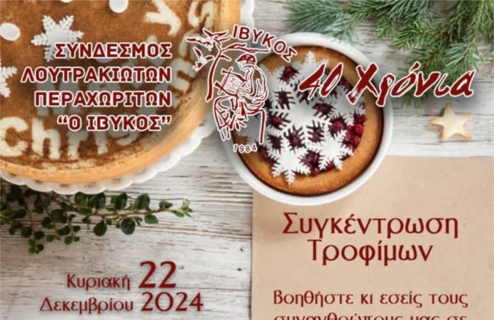 Ο «Ίβυκος», συγκεντρώνει τρόφιμα μακράς διαρκείας για να στηρίξει τις ευάλωτες ομάδες των συμπολιτών μας, την Κυριακή 22 Δεκεμβρίου 2024 και ώρα 19:00’μ.μ., στην είσοδο του Αλεξάνδρειου Συνεδριακού Κέντρου στο Λουτράκι, ημέρα που θα παρουσιάσουμε τη Χριστουγεννιάτικη παράσταση του Συλλόγου με θέμα «40 χρόνων Χριστούγεννα».