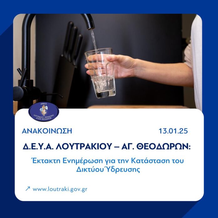 Η Δημοτική Επιχείρηση Ύδρευσης – Αποχέτευσης Λουτρακίου – Αγίων Θεοδώρων ενημερώνει τους δημότες ότι λόγω των έντονων και συνεχιζόμενων βροχοπτώσεων, παρουσιάστηκε εκ νέου σοβαρό πρόβλημα στο δίκτυο ύδρευσης, με τη θολότητα του νερού να είναι ιδιαίτερα αυξημένη.