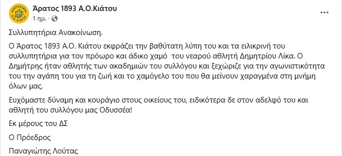Συγκλονισμένη είναι η Κορινθία από το θάνατο του νεαρού αθλητή Δημήτρη Λίκα. Ο νεαρός αγωνιζόταν στις ακαδημίες στο Άρατου Κιάτου, στο τμήμα της καλαθοσφαίρισης.