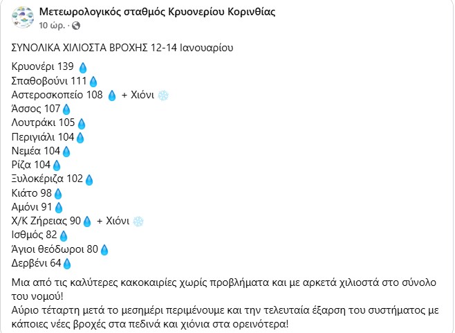 Χόρτασε η γη νεράκι από τις τελευταία «καλή» κακοκαιρία που πέρασε από τον νομό μας. Ο Μετεωρολογικός Σταθμός Κρυονερίου εξέδωσε χθες το βράδυ δελτίο τύπου με τα χιλιοστά βροχόπτωσης ανά τμ που έριξε ανά περιοχή.
