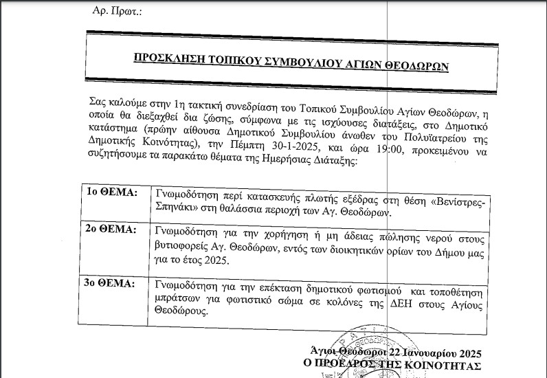 ΤΟΠΙΚΑΛουτράκι Πλωτή εξέδρα στους Αγίους Θεοδώρους 22 Ιανουαρίου 2025, 14:03 FacebookTwitterEmailCopy URLΤυπώνω - Advertisement - Συνεδριάζει στις 30 Ιανουαρίου 2025 το συμβούλιο της δημοτικής κοινότητας Αγίων Θεοδώρων. Το πρώτο θέμα που θα απασχολήσει τη συνεδρίαση είναι η κατασκευή πλωτής εξέδρας. - Advertisement - ΑΦΗΣΤΕ ΜΙΑ ΑΠΑΝΤΗΣΗ Ακύρωση απάντησης Σχόλιο: εισάγετε το σχόλιό σας! Όνομα: παρακαλώ εισάγετε το όνομά σας εδώ Email: έχετε εισάγει εσφαλμένη διεύθυνση ηλεκτρονικού ταχυδρομείου! παρακαλώ εισάγετε εδώ την ηλεκτρονική σας διεύθυνση Ιστοσελίδα: αποθηκεύστε το όνομα, το ηλεκτρονικό ταχυδρομείο και τον ιστότοπό μου σε αυτό το πρόγραμμα περιήγησης για την επόμενη φορά που θα σχολιάσω. Δ Δείτε ακόμα Ελλάδα Βράβευση του Γρηγόρη Δημητριάδη από την Ελληνική Ομοσπονδία Πυγμαχίας (ΒΙΝΤΕΟ) Λουτράκι ΛΟΥΤΡΑΚΙ: Το λιγότερο που μπορούμε να κάνουμε είναι να βοηθήσουμε την μάνα του 17χρονου Αλέξη Κυριότερες ειδήσεις Είδηση ΒΟΜΒΑ για Comer Group του καζίνο Λουτρακίου! Κυριότερες ειδήσεις Παραπολιτικά για Ολυμπιακό Λουτρακίου-Σήμερα στις 6μμ η κρίσιμη Γενική Συνέλευση στο SPA Λουτράκι ΚΚΕ: Να εξασφαλιστεί η συνέχιση της ζωής και της δράσης του ιστορικού σωματείου του Ολυμπιακού Λουτρακίου! Σχετικά άρθρα Λουτράκι ΛΟΥΤΡΑΚΙ: Το λιγότερο που μπορούμε να κάνουμε είναι να βοηθήσουμε την μάνα του 17χρονου Αλέξη Κυριότερες ειδήσεις Είδηση ΒΟΜΒΑ για Comer Group του καζίνο Λουτρακίου! Κυριότερες ειδήσεις Παραπολιτικά για Ολυμπιακό Λουτρακίου-Σήμερα στις 6μμ η κρίσιμη Γενική Συνέλευση στο SPA Λουτράκι ΚΚΕ: Να εξασφαλιστεί η συνέχιση της ζωής και της δράσης του ιστορικού σωματείου του Ολυμπιακού Λουτρακίου!