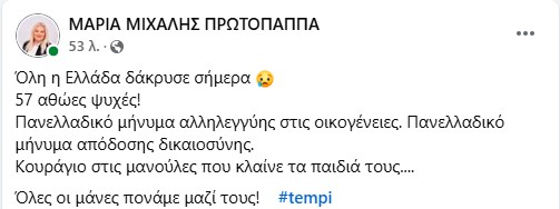 Η Μαρία Πρωτοπαππά έγραψε ένα μήνυμα για τη σημερινή ημέρα τιμής και μνήμης στα θύματα των Τεμπών.