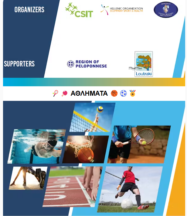 | Διοργάνωση & Συνεργασίες Ο Ελληνικός Οργανισμός Εργασιακής Άθλησης & Υγείας (𝗛𝗢𝗖𝗦𝗛) είναι ο επίσημος διοργανωτής των Αγώνων, σε συνεργασία με:Τον Δήμο Λουτρακίου – Περαχώρας – Αγίων Θεοδώρων.Την Περιφέρεια Πελοποννήσου.Τους Δήμους Κορινθίων και Βέλου-Βόχας.Πολλές αθλητικές ομοσπονδίες. Η διοργάνωση τελεί υπό την αιγίδα της Διεθνούς Συνομοσπονδίας Εργαζομένων και Ερασιτεχνών στον Αθλητισμό (CSIT), ενός διεθνούς πολυαθλητικού οργανισμού που ιδρύθηκε το 1913 στη Γάνδη του Βελγίου. Η CSIT έχει εξελιχθεί σε μια συνομοσπονδία με πάνω από 200 εκατομμύρια μέλη και μέσω αυτής της διοργάνωσης προσφέρει σε όλους τους μη επαγγελματίες αθλητές μια μοναδική εμπειρία αγώνων, προωθώντας το πνεύμα της φιλίας και της συνεργασίας. |