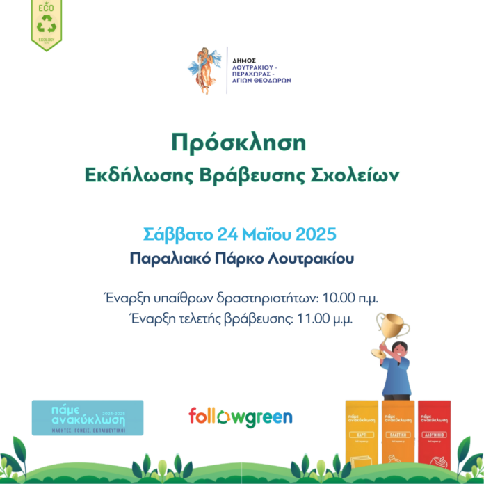 Η ανακύκλωση γίνεται γιορτή και τα παιδιά δείχνουν τον δρόμο για ένα πιο πράσινο μέλλον. Για ακόμη μία χρονιά, ο Δήμος Λουτρακίου – Περαχώρας – Αγίων Θεοδώρων τιμά τη δράση και την προσπάθεια των σχολείων του, μέσα από μια εκδήλωση που έχει πλέον καθιερωθεί ως θεσμός. Το Σάββατο 24 Μαΐου, το Παραλιακό Πάρκο Λουτρακίου μεταμορφώνεται σε έναν ζωντανό χώρο δημιουργίας, συμμετοχής και περιβαλλοντικής συνείδησης, όπου θα βραβευτούν τα σχολεία που ξεχώρισαν στις δράσεις ανακύκλωσης κατά τη σχολική χρονιά 2024 – 2025.