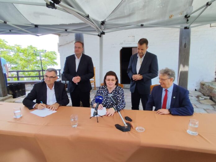 Σύμβαση δωρεάς για την υλοποίηση του έργου «Εκτέλεση εργασιών στερέωσης και πυροπροστασίας του συγκροτήματος Πύργου Προσφορίου Ουρανούπολης» υπέγραψαν η Υπουργός Πολιτισμού Λίνα Μενδώνη και ο Πρόεδρος της «Ελληνικός Χρυσός Α.Ε.», Χρήστος Μπαλάσκας, παρουσία του Δημάρχου Αριστοτέλη Στέλιου Βαλιάνου.