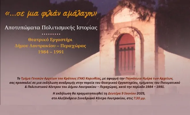 Με αφορμή την Παγκόσμια Ημέρα των Αρχείων, το Τμήμα Γενικών Αρχείων του Κράτους Κορινθίας μας προσκαλεί σε ένα ταξίδι στην ιστορία του Θεατρικού Εργαστηρίου Λουτρακίου – Περαχώρας (1984–1991), αναδεικνύοντας μια μοναδική πτυχή της πολιτιστικής μας ταυτότητας.