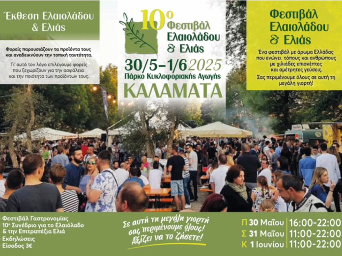 Το 10ο Φεστιβάλ Ελαιολάδου & Ελιάς ανοίγει τις πύλες του την Παρασκευή 30 Μαΐου στις 16:00 και θα διαρκέσει έως το βράδυ της Κυριακής 1 Ιουνίου, στο Πάρκο Κυκλοφοριακής Αγωγής στην Καλαμάτα.