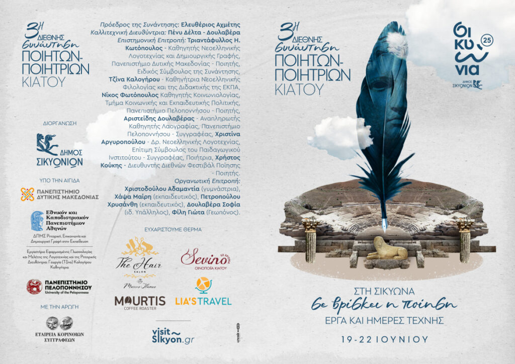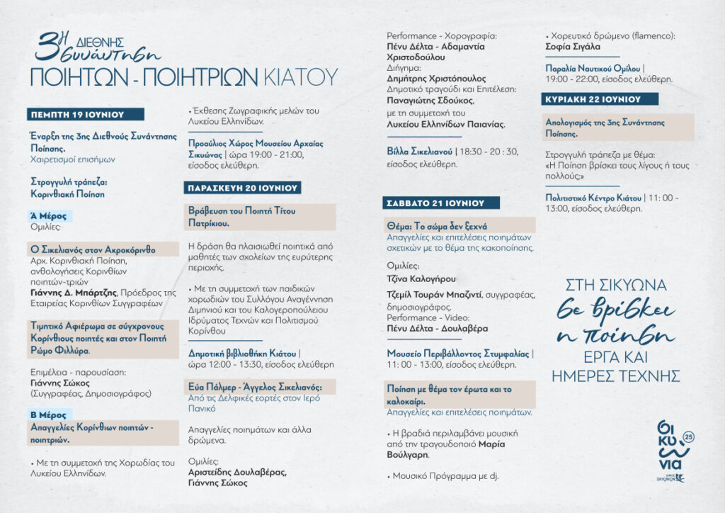 Σας προσκαλούμε στην 3η Διεθνή Συνάντηση Ποιητών – Ποιητριών Κιάτου, που θα πραγματοποιηθεί από Πέμπτη 19 έως Κυριακή 22 Ιουνίου 2025, σύμφωνα με το συνημμένο πρόγραμμα.