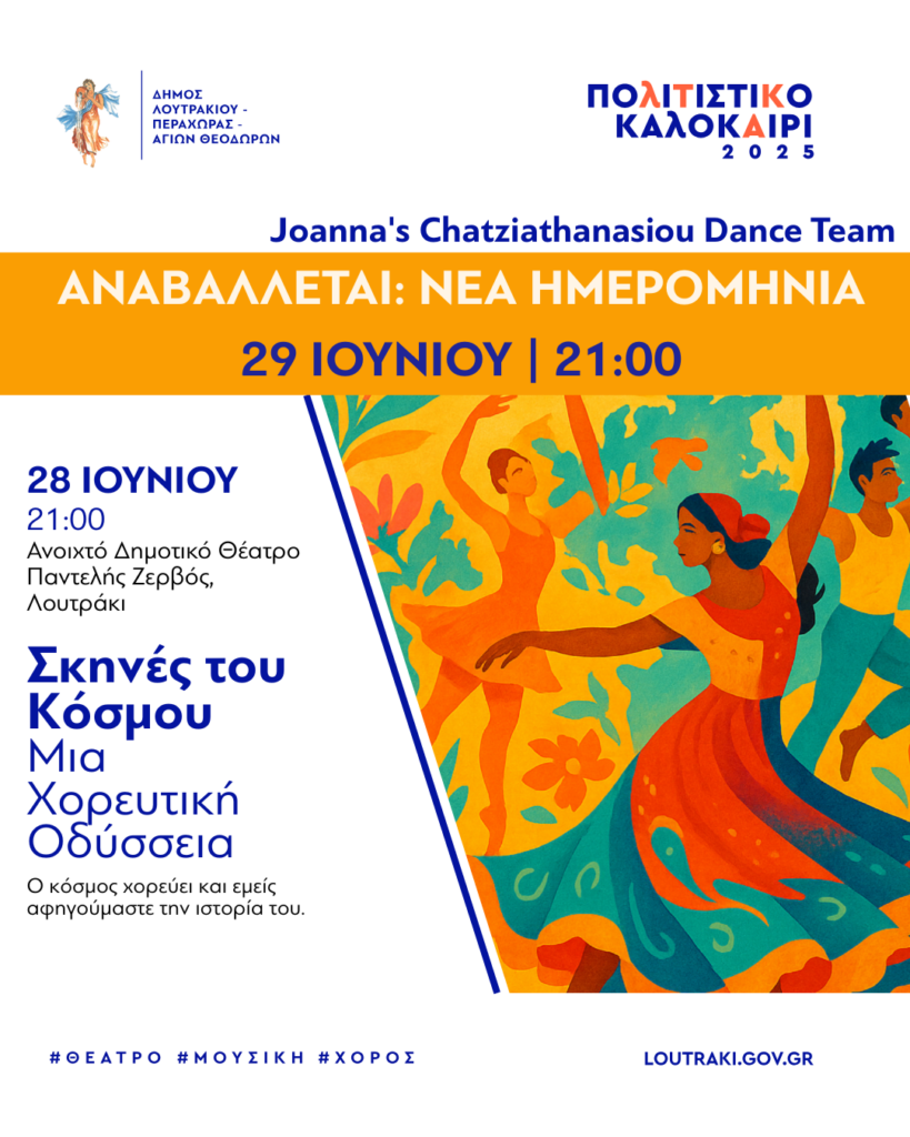 Λόγω των καιρικών συνθηκών, η παράσταση «Σκηνές του Κόσμου – Μια Χορευτική Οδύσσεια» από την ομάδα χορού της Ιωαννα χατζηαθανασιου αναβάλλεται.