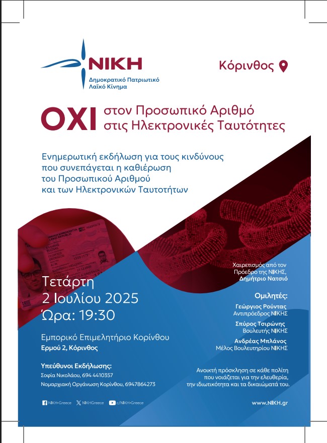 Ενημερωτική εκδήλωση της Νομαρχιακής Οργάνωσης Κορίνθου του Δημοκρατικού Πατριωτικού Λαϊκού Κόμματος ΝΙΚΗ για τους κινδύνους που συνεπάγεται η καθιέρωση του Προσωπικού Αριθμού και των Ηλεκτρονικών Ταυτοτήτων.
