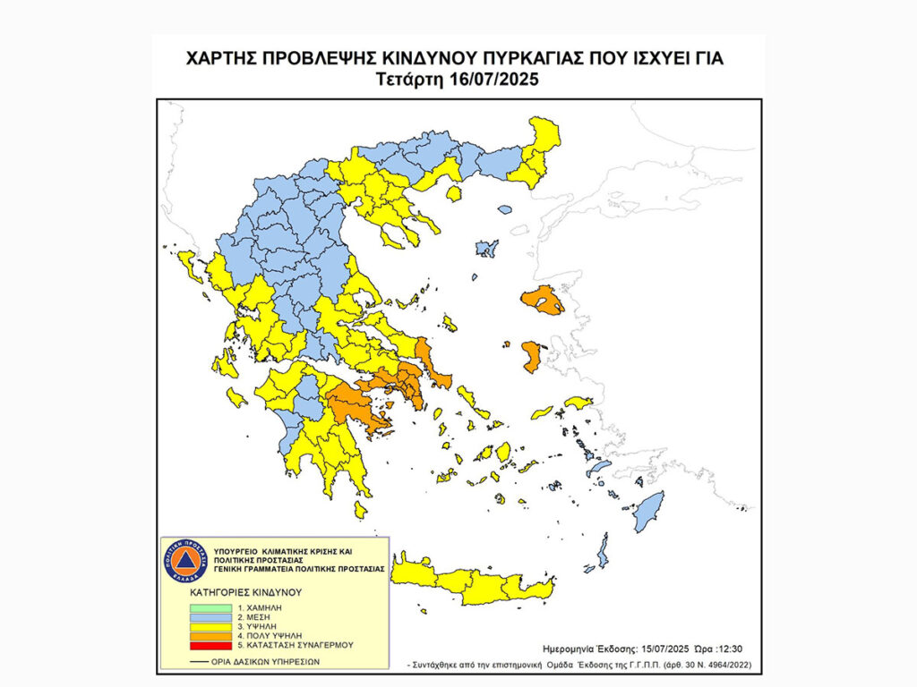 Σύμφωνα με το Χάρτη Πρόβλεψης Κινδύνου Πυρκαγιάς, τον οποίο εκδίδει η Γενική Γραμματεία Πολιτικής Προστασίας του Υπουργείου Κλιματικής Κρίσης & Πολιτικής Προστασίας για την Τετάρτη 16 Ιουλίου προβλέπεται πολύ υψηλός κίνδυνος δασικής πυρκαγιάς (κατηγορία κινδύνου 4) στις Περιφερειακές Ενότητες Αργολίδας και Κορινθίας και κατηγορία κινδύνου 3 στις υπόλοιπες Περιφερειακές Ενότητες.