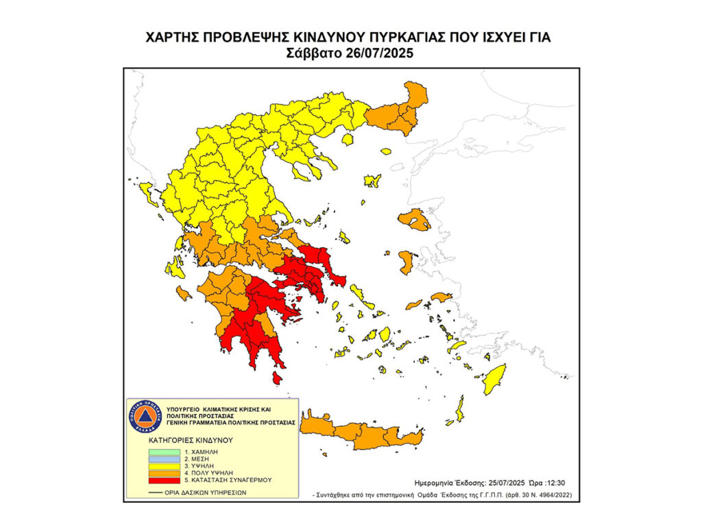 Σύμφωνα με το Χάρτη Πρόβλεψης Κινδύνου Πυρκαγιάς, τον οποίο εκδίδει η Γενική Γραμματεία Πολιτικής Προστασίας του Υπουργείου Κλιματικής Κρίσης & Πολιτικής Προστασίας για το Σάββατο 26 Ιουλίου προβλέπεται Ακραίος κίνδυνος πυρκαγιάς – Κατάσταση Συναγερμού (κατηγορία κινδύνου 5) για την Περιφέρεια Πελοποννήσου