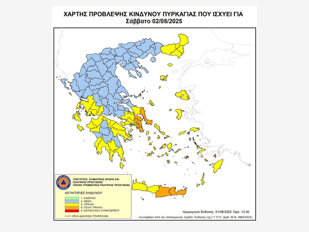 Σύμφωνα με το Χάρτη Πρόβλεψης Κινδύνου Πυρκαγιάς, τον οποίο εκδίδει η Γενική Γραμματεία Πολιτικής Προστασίας του Υπουργείου Κλιματικής Κρίσης & Πολιτικής Προστασίας για το Σάββατο 2 Αυγούστου προβλέπεται υψηλός κίνδυνος δασικής πυρκαγιάς (κατηγορία κινδύνου 3) στις Περιφερειακές Ενότητες Αργολίδας, Κορινθίας, Λακωνίας, Μεσσηνίας.
