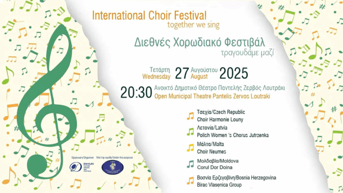 Το Διεθνές Χορωδιακό Φεστιβάλ «Τραγουδάμε μαζί» (Together we sing) έρχεται να γεμίσει με νότες το Ανοιχτό Θέατρο «Παντελής Ζερβός» στο Λουτράκι, την Τετάρτη 27 Αυγούστου.