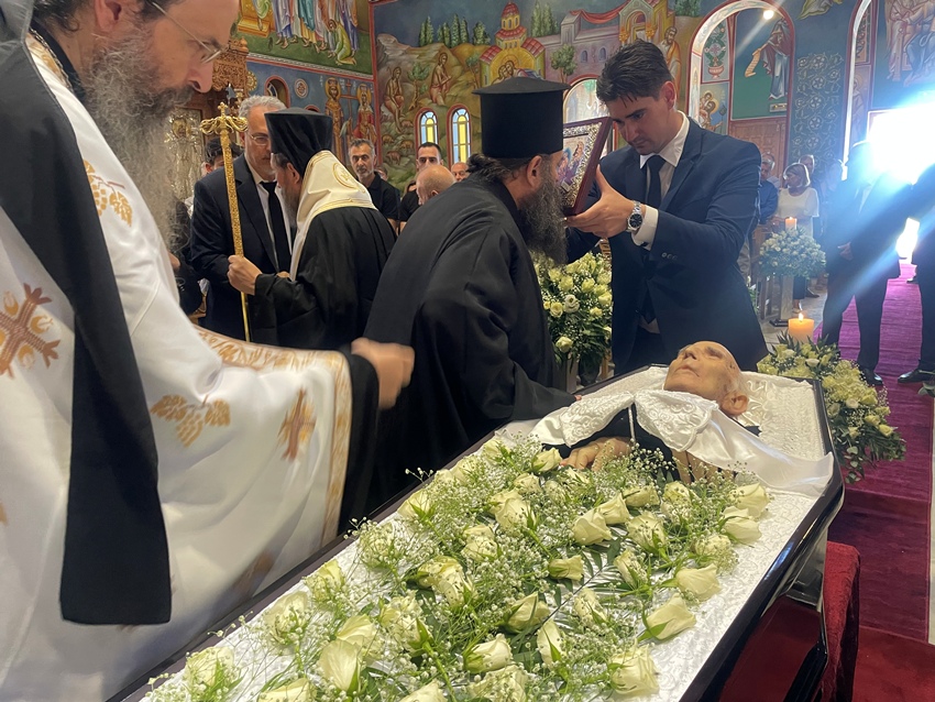 Ευθύς μετά το πέρας της Θ. Λειτουργίας ο Θεοφιλέστατος, συνοδευόμενος από τους Διακόνους αλλά και τους πατέρες της Ι. Μονής Αναστάσεως Χριστού Λουτρακίου π. Πρόδρομο και π. Λογγίνο, παρέστη στην Εξόδιο Ακολουθία του αοιδίμου ομοτίμου Καθηγητού του ΕΚΠΑ Χαραλάμπους Σωτηροπούλου, που τελέσθηκε στον Ι. Ν. Αγίου Νεκταρίου Άλσους-Πανοράματος Βούλας της Ι. Μητροπόλεως Γλυφάδας, μετά του οποίου οικογενειακώς συνεδέοντο πλέον της εικοσαετίας, χρονικό διάστημα κατά το οποίον ο μακαριστός έψαλλε και εκήρυττε εις την Ι. Μονήν Αναστάσεως Χριστού.