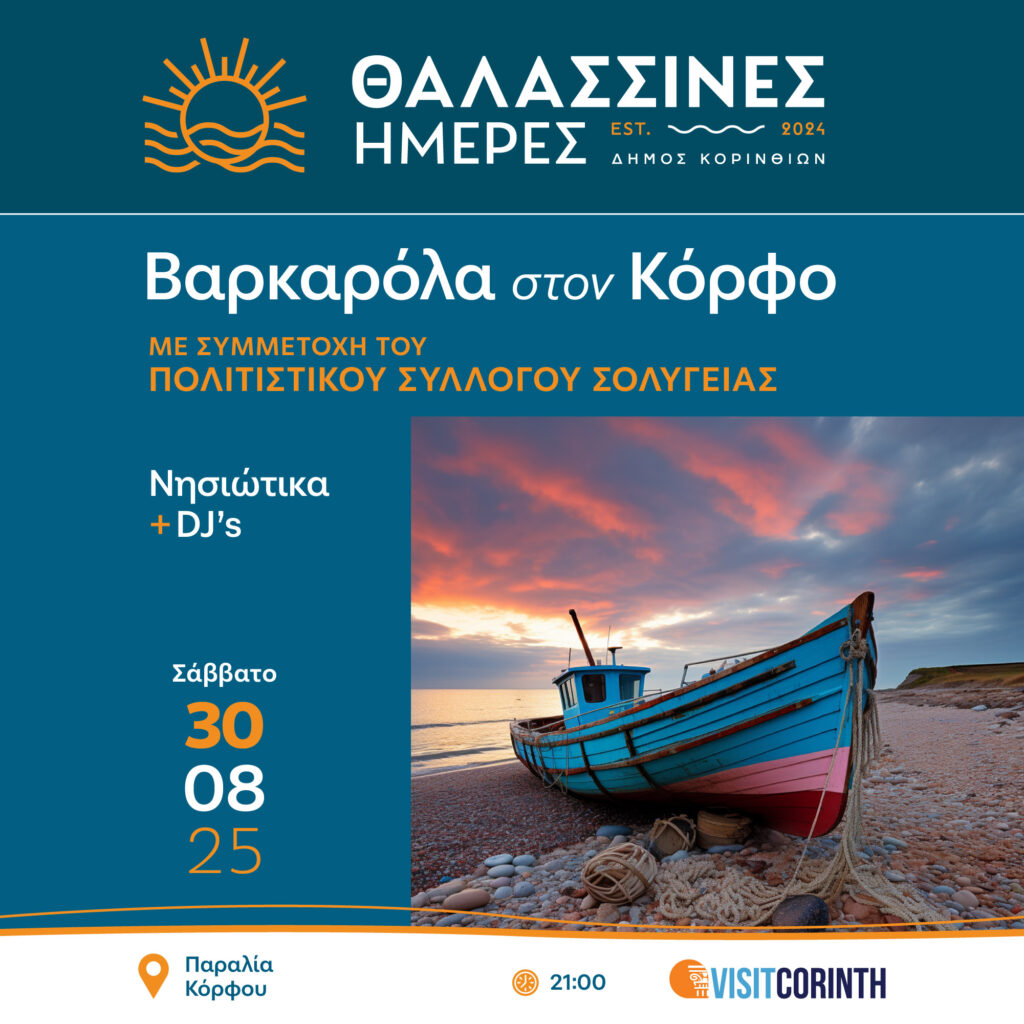 Και το Φεστιβάλ των «Θαλασσινών Ημερών» συνεχίζεται! Σήμερα, Σάββατο 30 Αυγούστου, στην Παραλία Κόρφου μάς περιμένει η εντυπωσιακή Βαρκαρόλα, ένα μαγευτικό πλωτό δρώμενο με φωτισμένες βάρκες και τη συμμετοχή ερασιτεχνών αλιέων, συνοδεία νησιώτικης μουσικής.