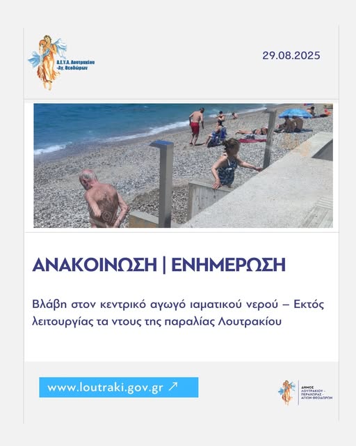 Ο Δήμος Λουτρακίου – Περαχώρας – Αγίων Θεοδώρων ενημερώνει το κοινό ότι παρουσιάστηκε βλάβη στον κεντρικό αγωγό του ιαματικού νερού, ο οποίος τροφοδοτεί τα ντους της παραλίας Λουτρακίου.
